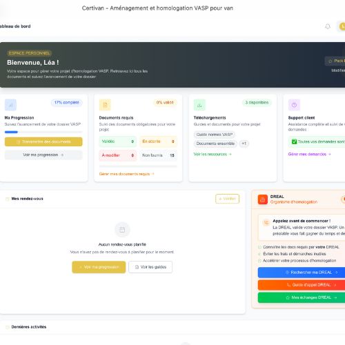 Un accompagnement étape par étape, adapté à votre projet. Certivan vous conseille sur votre aménagement, constitue votre dossier d’homologation VASP, assure le dépôt à la DREAL et vous accompagne jusqu’à l’obtention de votre carte grise VASP autocaravane.