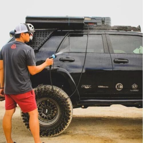 Le Rinsekit Rack peut stocker jusqu'à 19L d'eau et est la seule douche portable entièrement électrique grâce à sa batterie AGM de 5Ah intégrée, pour une utilisation de 3 à 5 ans. Cette batterie vous offre une pulvérisation haute pression constante où que vous soyez pour un confort presque comme à la maison. Avec sa capacité de 19L, profitez de 9 minutes d'eau en continue.