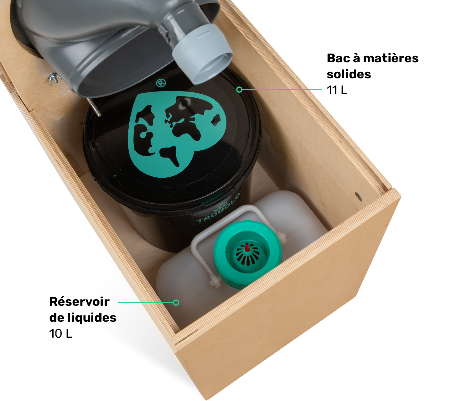 Le TROBOLO TeraBlœm renferme un bac de 11 litres pour les matières solides et un réservoir de 10 litres pour les liquides. Notre séparateur dissocie efficacement les excréments en les dirigeant vers les récipients prévus à cet effet. Tout est propre et net.