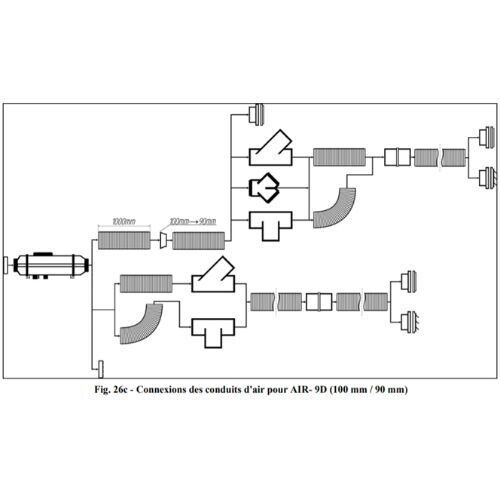 Le système de conduit d'air doit toujours commencer par le diamètre désigné pour le type de chauffage (2D : 60 mm, 4D : 90 mm, 9D : 100 mm), après que ce diamètre puisse être réduit en utilisant différents adaptateurs (voir Fig. 6b/c). L'utilisation de diamètres plus petits que ceux désignés pour le démarrage du système, à la sortie d'air chaud de l'appareil, entraîne une surchauffe de l'appareil de chauffage. Le premier mètre du conduit d'air doit être aussi droit que possible et au diamètre du chauffage .